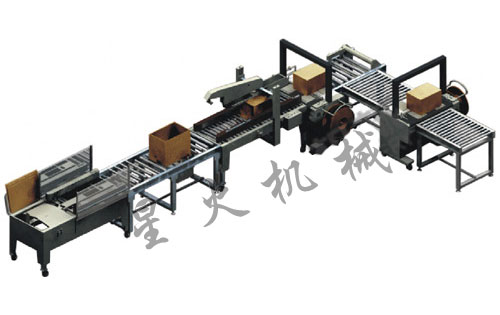 設備特點:下面來介紹下這款在周口打包機中很受歡迎的星火打包機,此款打包機設計非常的人性化:適用于紙箱規格變化不太頻繁的場合,自動完成上、下中縫的自動封箱和“ # ”字捆扎。有連續封底、自動折蓋封箱及“ # ”字或多道捆扎包裝的功能??煞奖愕耐ㄟ^人工調整適應紙箱大小變化。自動折蓋封底、自動折蓋封箱、自動輸送、對包裝物 90 °轉向、自動完成“ # ”字形多道捆扎。采用人機界面和優良的 PLC 、 LOGO 控制,全數字化操作,參數調整簡單,運行穩定。自動停線、自動喚醒,具有多重保護功能。配置靈活,可根據需要方便選擇。所以這么多有點都是為使用廠家量身定做的,這才讓星火打包機在周口打包機中發展的這么好。 設備參數:電源電壓 (V/Hz): AC 220/50 110/60總功率 (W) : 4100 較大封箱尺寸 (L×W×H) (mm) :500×400×450 較小封箱尺寸 (L×W×H) (mm) :180×260×130 流水線速度 (m/min) : 16 生產能力 (箱/小時) : 600 工作臺面高度 (mm) : 830 封箱膠帶 (mm) :BOPP, PVC 膠帶 , 寬 60、76mm 適用打包帶 (mm) : 機用塑料打包帶 寬 9-15 厚 0.5-1.1 空氣壓縮機(另配): 2/3 Litres at 5 bars 外形尺寸 (L×W×H) (mm) :呈“L”型 7850×3500×1700 凈重 (kg) :950 配置設備:DZF-5050自動拆蓋封箱機 1臺SJG-100/66 1米無動力輥簡輸送機 2臺 FXJ-5050Z自動拆蓋封箱機 1臺 SJGY-80/66 0.8米圓帶傳動輥簡輸送機 2臺 KZW-8060 無人化全自動捆扎機 2臺 SJZGY-140/66直角轉向圓帶傳動輥筒輸送機 1臺 設備3D效果圖